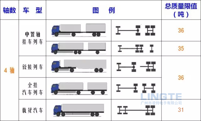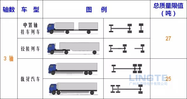 2、除驅(qū)動(dòng)軸外,下文中的二軸組、三軸組以及半掛車和全掛車,每減少兩個(gè)輪胎,其總質(zhì)量限值減少3噸。